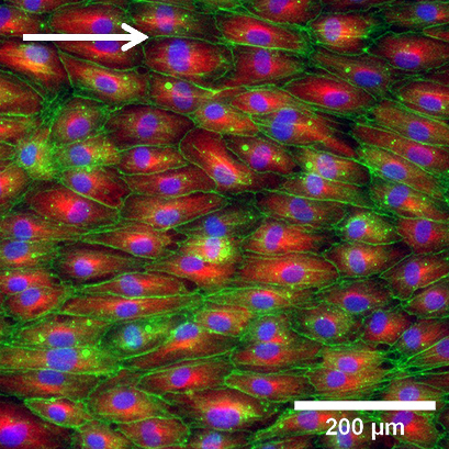 HUVEC在I型胶原蛋白(2 mg / ml)上以10 dyn /cm2的流量培养5天后的荧光显微镜检查 。