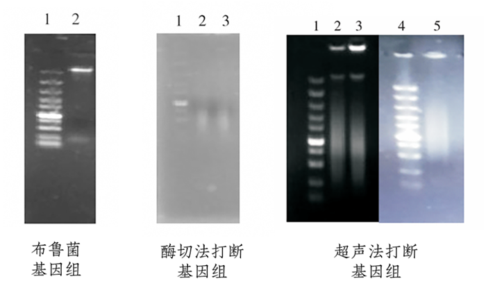 基因组打断效果检测分析:为了建立布鲁菌基因组随机文库,通过用Sau3AI 酶切和超声破碎基因组,得到想要的基因片段,为后续试验做准备。所需基因片段小于500 bp,片段均匀,大小适中(通过调整不同参数,确定最佳参数)。而通过电泳检测可知, 酶切法得到的基因片段大多数都是小片段,超声法得到的片段为一条抹带,符合后续试验需要。