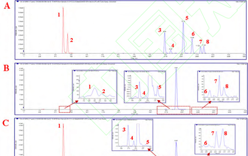 在此基础上通过超高通量组织研磨仪和真空离心浓缩仪进行优化实验步骤,超高通量组织研磨仪使样品均质化更彻底,方便后续萃取;真空离心浓缩仪补充了溶液蒸发过程中的爆沸,减去了添加饱和NaCl的步骤,减少后续离子干扰,使本实验方法更快速安全,灵敏准确。
