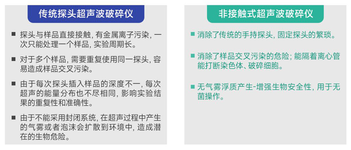 非接触式样品可在密闭容器下进行破碎,不产生感染性飞雾,超声探头与样品不接触,避免交叉污染。对于每天要处理多个样品或者贵重样品的实验室,非接触超声波DNA破碎仪具有处理高通量,样本低损耗无交叉污染等优势。逐渐成为ChIP(染色质免疫共沉淀)和DNA剪切研究平台不可缺少的标准化工具。