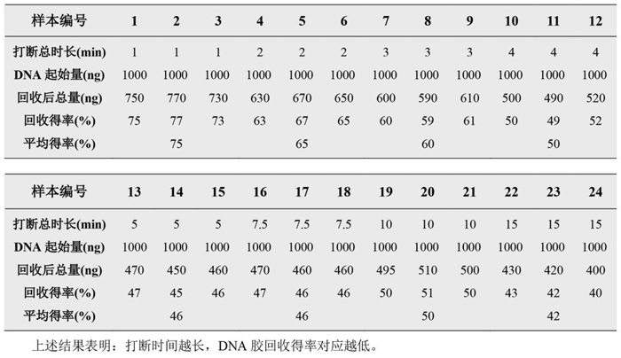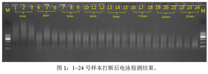 实验结果表明:(1) 随着打断时间的增加,打断片段的大小也随之变小;(2) 相同打断条件下,打断效果的重复性和均一性良好。