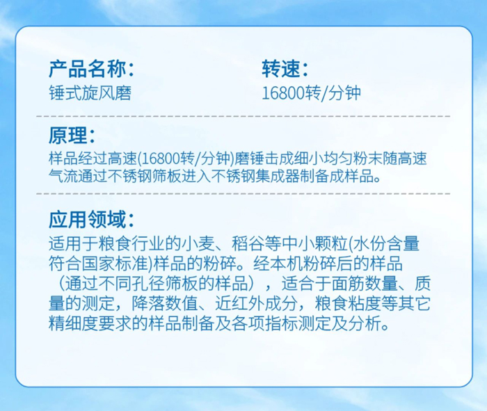 在小麦农药残留检测这场与精准度的赛跑中,样品研磨作为前处理的关键一环,直接决定着检测结果的可靠性。选用专业的锤式旋风磨,借助其高速旋转的研磨锤与独特旋风分离技术,可有效避免传统研磨弊端 —— 让每一粒小麦样品在强劲锤击与气流剪切力作用下,被精细粉碎为微米级均一粉末,既通过物理研磨机制杜绝热效应导致的成分损失,又以高效破壁能力大幅提升农药残留的提取效率。