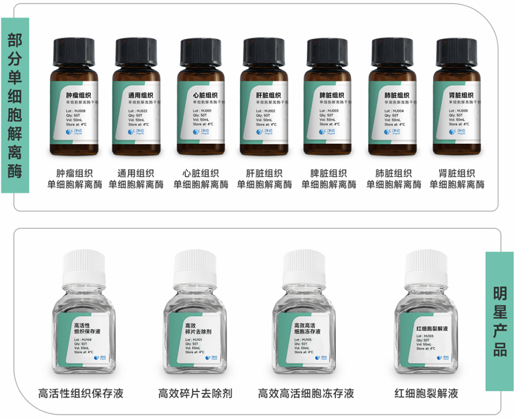 产品简介:上海净信推出了一系列针对不同组织的特异性单细胞解离酶,专为高质量单细胞悬液制备而设计。产品采用了高纯度、多元化酶配方,可快速、温和解离组织样本,最大限度保持细胞活性和完整性,适用于各类原代细胞提取、培养、流式分析、类器官、肿瘤组织解离及单细胞测序等研究。